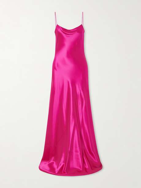Alaïa's gown is beautifully bias-cut from the house's vibrant rose silk-satin and looks worthy of any red carpet. Defined by a sharp square neckline, the back is cinched by a panel for an elegant draped effect.