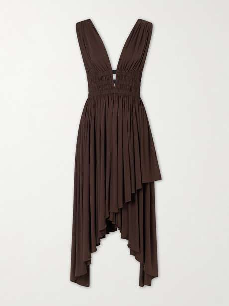 Restraint and expression converge through refined craft in Alaïa Spring ’26. Draped from fluid jersey, the plunging neckline is drawn together by slim straps before falling to an asymmetric hemline.