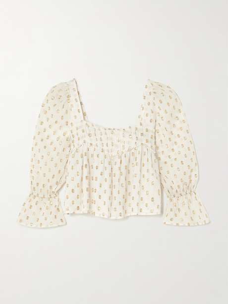 Alix of Bohemia's designs always have such feminine charm, and this 'Priya' blouse captures that spirit effortlessly. Cut from airy gauze scattered with shimmering fil coupé dots, it has a pintucked neckline and floaty blouson sleeves. It's a piece that'll instantly elevate denim, a skirt or linen pants.