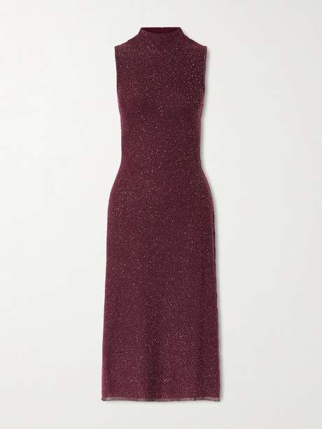 Altuzarra's 'Marian' dress is flecked with metallic threads that sparkle as they catch the light. Woven with a generous amount of wool, it has a chic high neckline and gently skims your figure as it falls. Match your lipstick to the deep burgundy shade.
