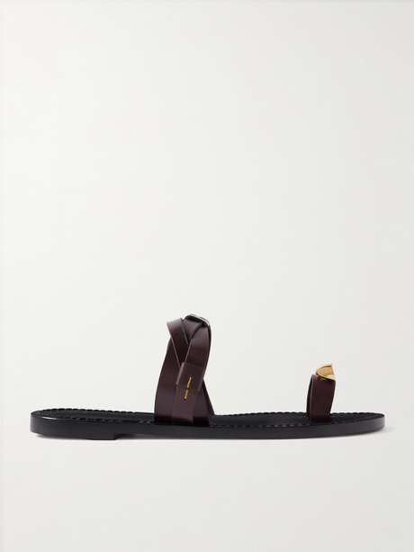 Amanu's sandals have two braided straps made from rich chocolate-brown leather. They're detailed with gold-tone hardware, which coordinates with the decorative top-stitching.
