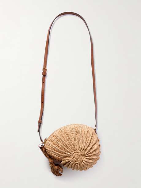 Anya Hindmarch's whimsical collections are bursting with personality. This shoulder bag is woven from raffia that's playfully designed to resemble a hermit crab and is trimmed with smooth leather. Stow your lipstick, cardholder and keys inside.