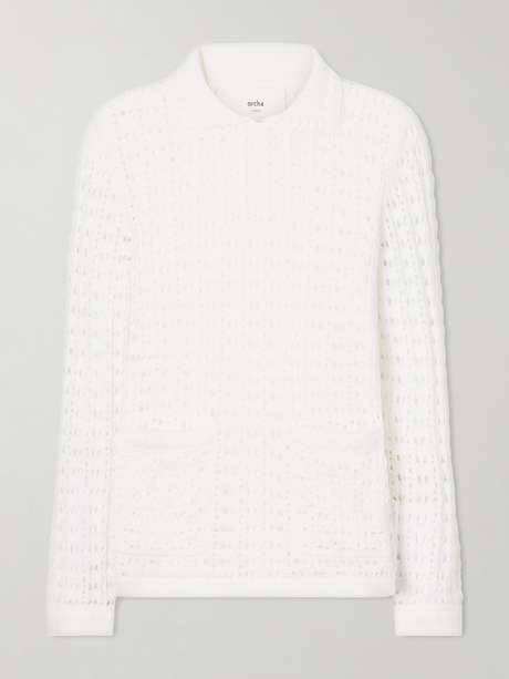 Crafted from soft cashmere, this open-knit sweater by Arch4 reflects the label’s refined approach to elevated essentials. The airy crochet construction creates subtle texture, while the relaxed silhouette is framed by a classic crew neckline. Patch pockets add a casual note to the lightweight design.
