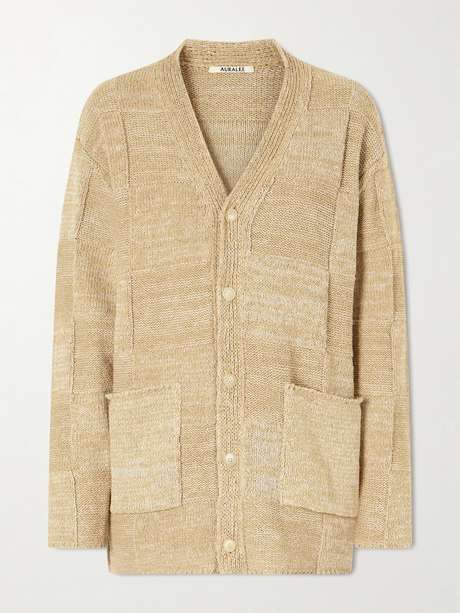 Texture and material are the core of this cardigan by Auralee. Spun from a richly slubbed knit, the fabric reveals subtle variations in tone and surface for a tactile, almost handwoven effect. The relaxed silhouette features a deep V-neckline, tonal buttons and oversized patch pockets.