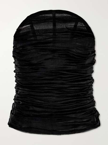 This ruched silk-chiffon bustier by Balenciaga explores texture through compression and transparency. Gathered across the body, the sheer fabric creates an almost shadowed effect, contouring the silhouette.