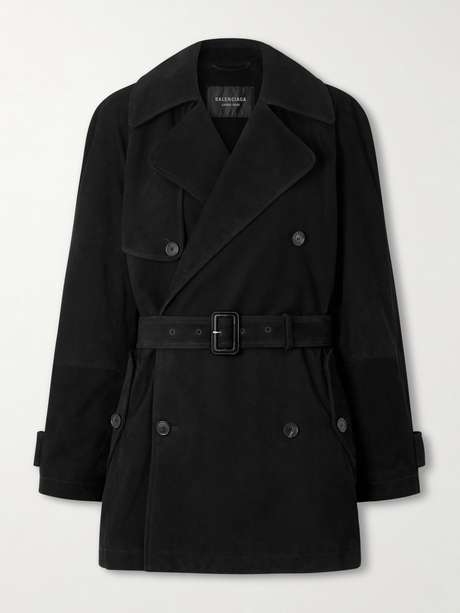 Balenciaga's trench coat is re-imagined in a supple suede, shorter length. It has a double-breasted front, storm flap, notched lapels and is belted for a little definition.