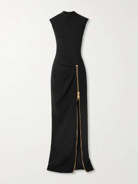 Balmain's gown will provide a true bombshell moment. Made from slinky jersey, it has padded shoulders, and a ruched skirt with a gold-tone zip through the slit. Style yours with heeled sandals and a clutch.