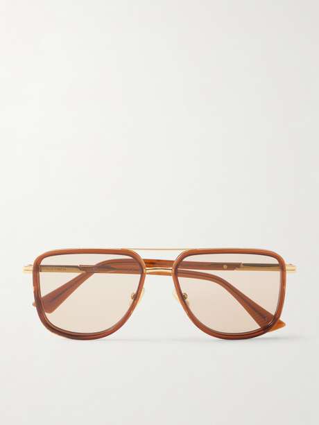 Bottega Veneta Eyewear blends acetate and gold-tone metal to striking effect in this aviator style. The mixed materials create depth and contrast within the classic silhouette.