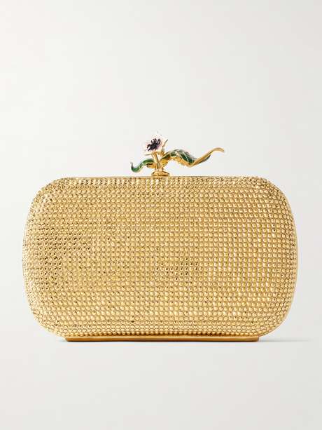 Bottega Veneta’s minaudière clutch is covered in crystals, certain to catch the light from every angle. It's topped with a stunning enameled flower clasp and opens to a gleaming gold leather lining, matching its exterior. There's space inside for your phone, cards and lipstick.
