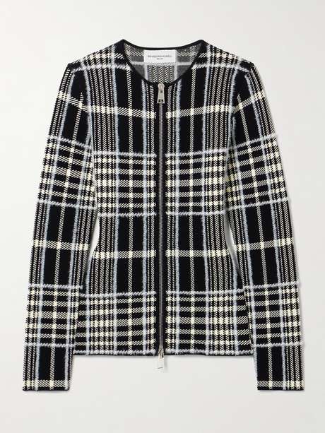 Brandon Maxwell's 'The Greer' cardigan is sleek and sophisticated. It's jacquard-knitted with monochrome checks outlined with fluffy yarn. Complement the slim fit and nipped-in waist with the matching skirt.