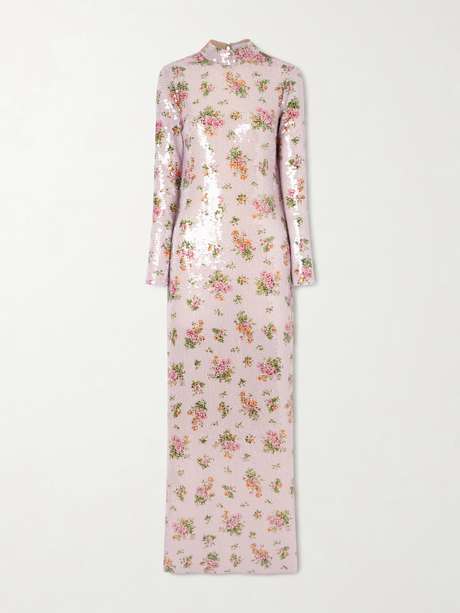 Romantic sparkle meets modern elegance in this gown by Brandon Maxwell. Crafted in a soft blush tone, the floor-length silhouette is embellished with shimmering sequins arranged in delicate floral motifs that catch the light with every step. A high neckline and long sleeves frame the streamlined shape, allowing the intricate surface to take center stage.