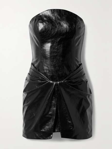 Brandon Maxwell's 'The Josie' dress has a split, twist-front that creates the illusion of a mini skirt layered on top. It's made from glossy textured-leather for a slim fit and features a curved strapless neckline. The internal corset is boned for additional support.