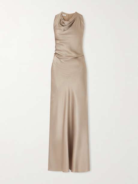Brunello Cucinelli's dress is gently gathered around the shoulders, creating a softly draped cowl neckline. It's been made in Italy from fluid silk that's cut on the bias, skimming your figure and pooling at the floor.