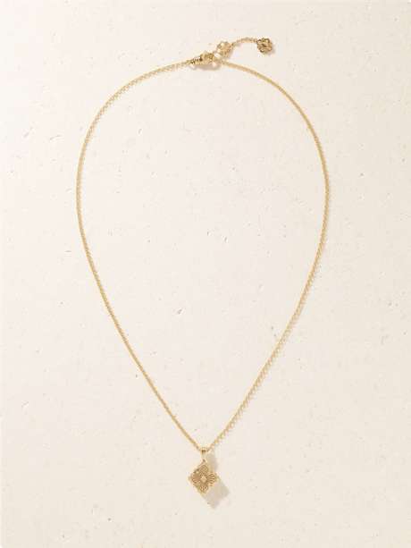 Buccellati's 'Opera Tulle' necklace captures the house's intricate artistry in miniature form. The pendant layers mother-of-pearl beneath a sunburst tulle motif, made from an 18-karat gold rosette framed by scalloped edges.