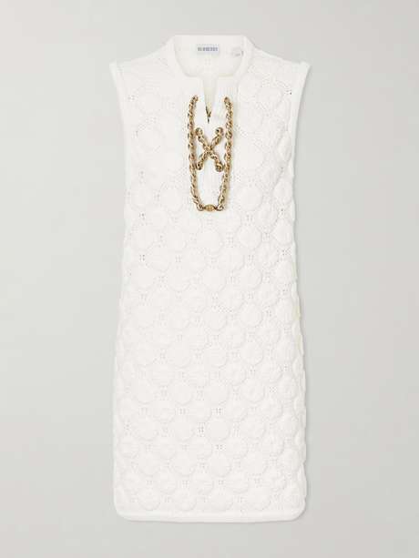 Echoing the organic textures of the Spring '26 collection, Burberry's mini dress is knitted from a soft cotton-blend with intricate swirling motifs. The sleeveless silhouette is punctuated by a chain-embellished neckline.