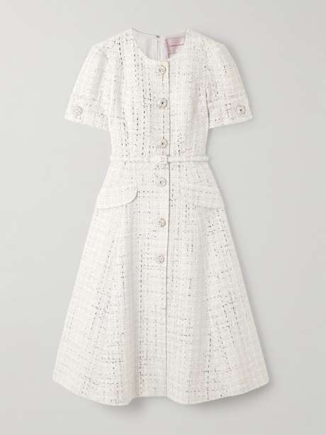 Carolina Herrera's dress has a chic, retro feel. Made from tweed, it's flecked with metallic threads that catch the light prettily and has a slim waist belt and A-line skirt. The covered buttons are subtly detailed with tiny crystals, too.