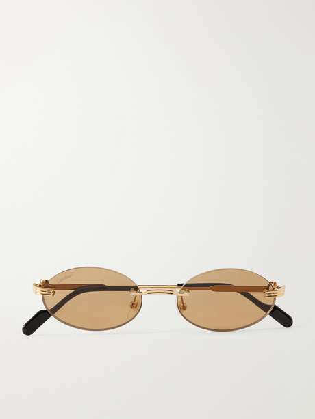 Cartier Eyewear’s rimless sunglasses are crafted with pale-bronze oval lenses and slender metal arms tipped with dark acetate. The minimal silhouette highlights the house’s refined approach to design, while adjustable nose pads ensure a comfortable fit.