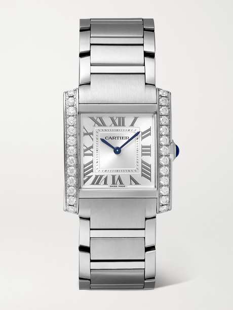 The brilliant-cut diamonds on Cartier's 'Tank Française' watch outline the sleek square case, which draws inspiration from military vehicles that fought during World War I. Animated by a Swiss-made quartz movement, this stainless steel timepiece has a substantial 32mm diameter and a silvered sunray dial that makes for a striking contrast with the blued steel hands. The angular links of the chunky bracelet are both brushed and polished.