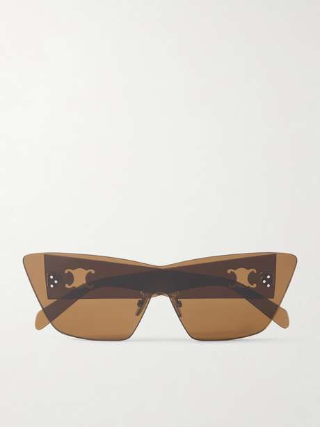 CELINE Eyewear’s sunglasses feature an angular silhouette with warm brown tinted lenses and slim metal hardware. Signature Triomphe motifs are set at the temples, adding a distinctive house detail.