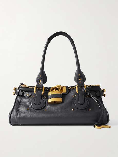 Chemena Kamali revives Chloé’s iconic ‘Paddington’ tote with updated details, marking 20 years since its debut on the Spring ’05 runway. This version is made from midnight-blue leather in an East-West barrel shape with adjustable gussets and gold-tone hardware, including a padlock and key. Add the label's plush charms and stow your phone, wallet and a few cosmetics inside.