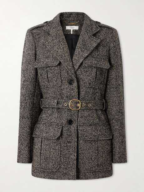 CHLOÉ Belted herringbone wool-blend jacket