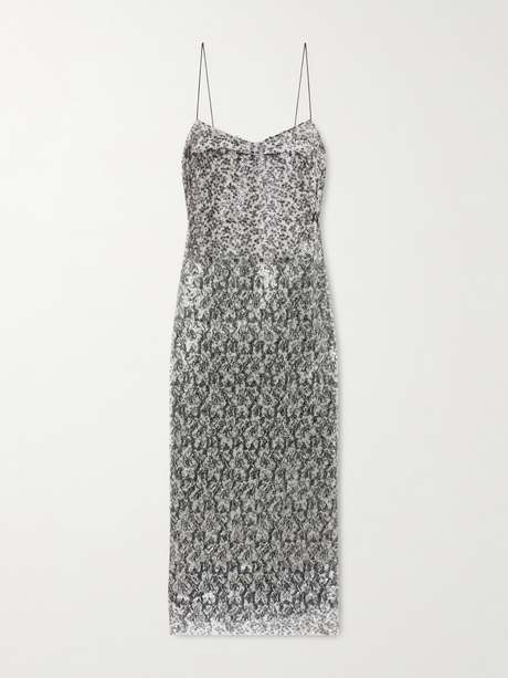 Christopher Esber's midi dress is cut from semi-sheer lace and overlaid with sparkling metallic sequins artfully arranged in floral motifs. Capitalize on the open neckline, highlighting your decolletage with glinting jewels.
