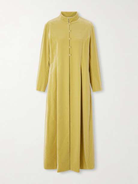 Traditional housecoats inspire this style from Colleen Allen. Made from plush cotton-velvet, it has an enveloping, longline shape with a stand collar and loop-fastening, covered buttons. It comes in a bright chartreuse shade the label calls 'Celery'.