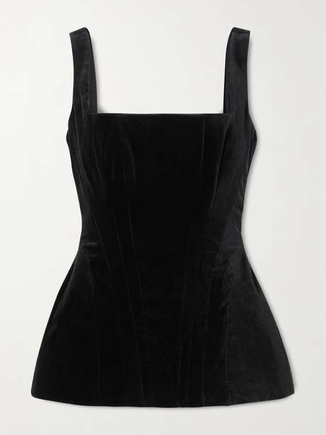 Old Hollywood glamour inspires Costarellos' 'Lereen' bustier top. Made from black cotton-velvet, it has an elegant square neckline and fits close through the bodice before flaring out at the hip for an hourglass shape. Wear it with tailored pants or even jeans.