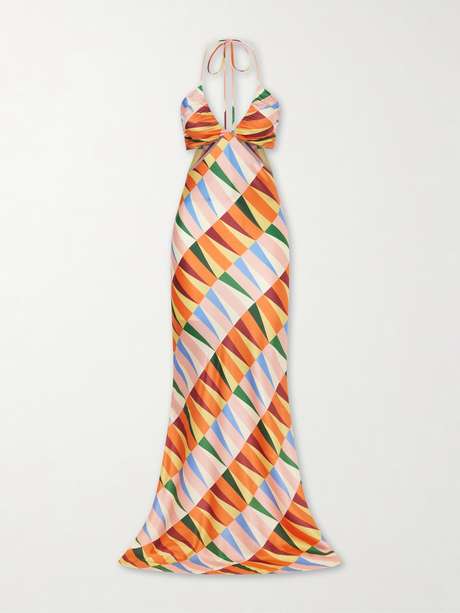 Cristiano Marcheli's 'Caterina' dress captures the vibrancy of Mediterranean nights. Made from silk-blend satin, it’s designed with a halter neckline and subtle cutouts, while vibrant geometric motifs follow the fluid frame through to the sweeping hem.