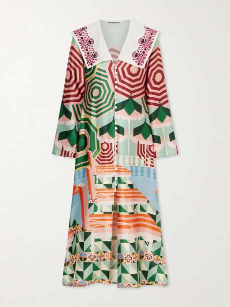The print on Cristiano Marcheli's 'Sofia' dress resembles an abstract painting. Made in Greece from silk-blend satin, it has a plantree collar detailed with floral embroidery and loop buttons across the front. Style it with sandals.