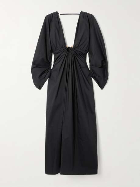 Cult Gaia's 'Elyza' dress is gathered at the plunging neckline by a sculptural gold-tone barbell. It's made from cotton-blend poplin and has a floaty shape with an alluring open back. Wear yours with a pair of the label's heels.