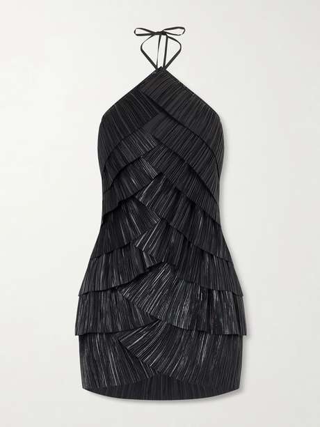 Cult Gaia's 'Varsha' dress mirrors the label's sculptural approach. Made from the signature plissé-satin, it’s shaped with overlapping tiers that fall from a slender halter neckline to a mini hemline.