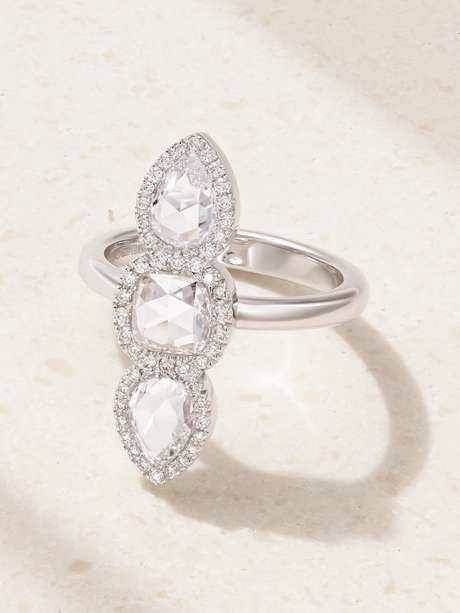 David Morris treats diamonds as the lens to another world; each stone is hand-selected for its rare brilliance. This ring has been handcrafted from 18-karat white gold and crowned with a trio of pear and cushion-cut diamonds surrounded by smaller stones. Wear it on your dominant hand for maximum impact.