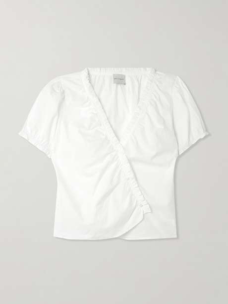 Deiji Studios makes loungewear so chic you'll want to wear it everywhere. Pretty with ruffles, this top is cut from crisp organic cotton in a fresh white shade and has a crossover design with glossy buttons.
