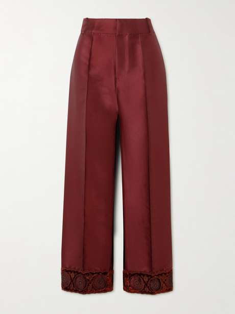 The velvet-trimmed cuffs on DESTREE's 'Yoshitomo' pants are detailed with metallic embroidery and beads to depict intricate florals. Tailored from lustrous faille, they're stitched with pleats through the front and have straight legs. We also carry the matching 'Amoako' jacket.