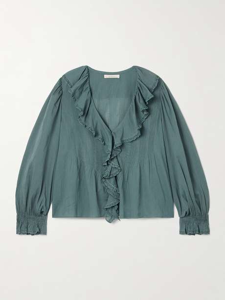DÔEN's 'Hardy' blouse has a cool Western feel enhanced by the pintucked bodice and lace-trimmed ruffles. It's made from organic cotton-voile and has fitted cuffs that create voluminous blouson sleeves. Style yours with relaxed jeans and a tote.