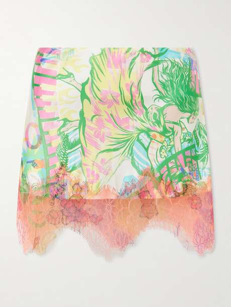 DONDE ESTEBAN Sonido Bestial lace-trimmed printed satin mini skirt