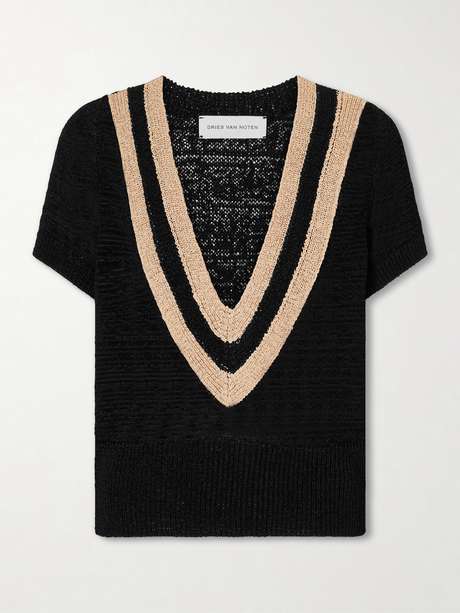 Dries Van Noten’s sweater refreshes the classic V-neck with contrasting borders. Knitted in Belgium from a soft fabric, it has short sleeves and a relaxed fit. Highlight the neckline with a pendant necklace.