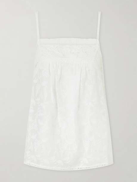 Eres’ ‘Amande’ top reimagines loungewear with a minimal yet romantic design. Crafted from lightweight cotton-blend voile, it features delicate floral embroidery and lace trim along the neckline and hem. Its relaxed, breezy fit makes it ideal for warm, leisurely days.