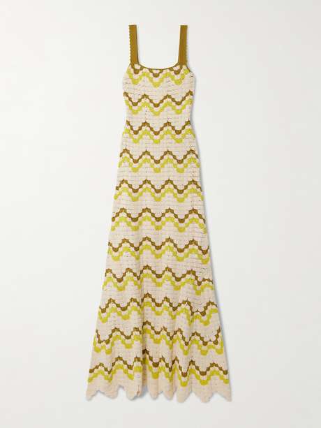 ESCVDO pays tribute to traditional Peruvian textiles in its collections, using ancestral weaving techniques. This 'Marea' maxi dress is crocheted from cotton to create a contrasting zigzag motif and designed to skim your curves before flaring at the scalloped hem. Take advantage of the slender straps to frame your favorite pendant.