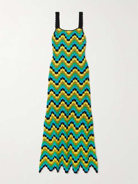 ESCVDO pays tribute to traditional Peruvian textiles in its collections, using ancestral weaving techniques. This 'Marea' maxi dress is crocheted from cotton to create a contrasting zigzag motif and designed to skim your curves before flaring at the scalloped hem. Take advantage of the slender straps to frame your favorite pendant.