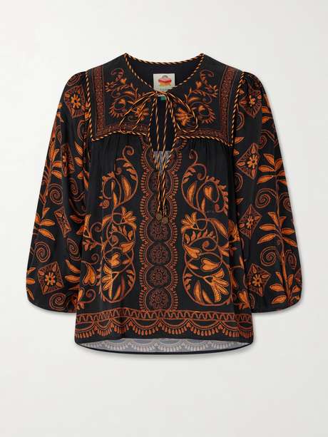 Bursting with color and charm, Farm Rio's 'Cornely Ainika' blouse illustrates the brand’s playful spirit. It's cut from lightweight voile with blouson sleeves and detailed with striped piping and bead-embellished ties. Pair yours with denim or printed shorts.