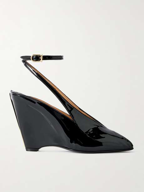 For Ferragamo's Fall '25 collection, Creative Director Maximilian Davis blends inspirations from the 1920s and 1980s through his unique vision. These 'Arcadia' pumps were worn on the runway, capturing attention with their sculpted wedge heels and deep V-shaped vamps. They've been made in Italy from glossy patent-leather with buckled straps that wrap around the ankles.