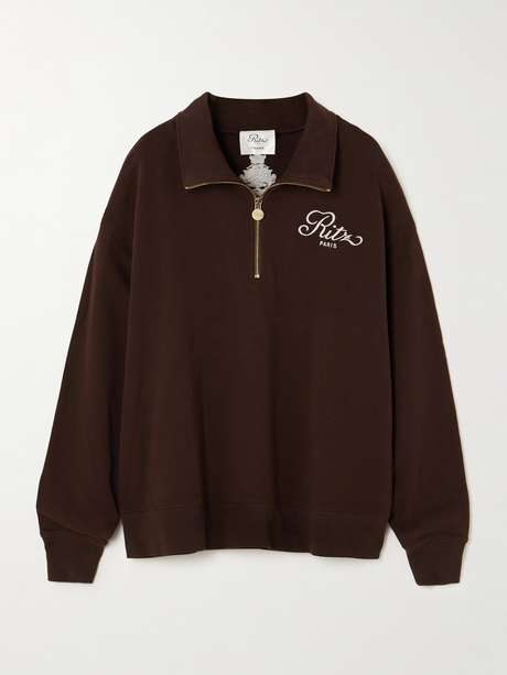 FRAME + Ritz Paris oversized embroidered cotton-jersey half-zip sweatshirt