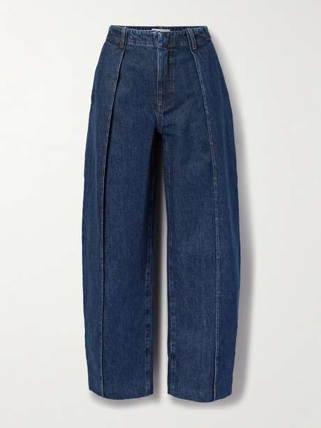 FRAME's jeans borrow elements from tailoring, including raised seams meant to resemble pleats and a concealed hook fastening in place of traditional buttons. They're cut from dark-blue denim and have a wide, barrel-leg shape.