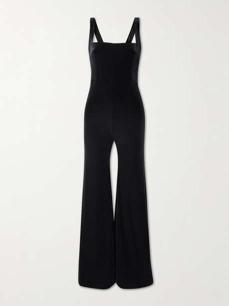 A Galvan jumpsuit deserves a place in every modern wardrobe. This 'Vesper' style is cut from plush black velvet with a streamlined, square-neck bodice and wide legs. Wear yours with platform pumps for a retro look.