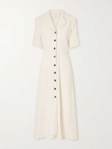 Giuliva Heritage’s midi dress reinterprets a classic silhouette with clean lines and thoughtful details. Knitted in a textured wave pattern, it has a fitted, elongated shape with a notched lapel collar and jewel-like buttons down the front, adding a subtle retro vibe.