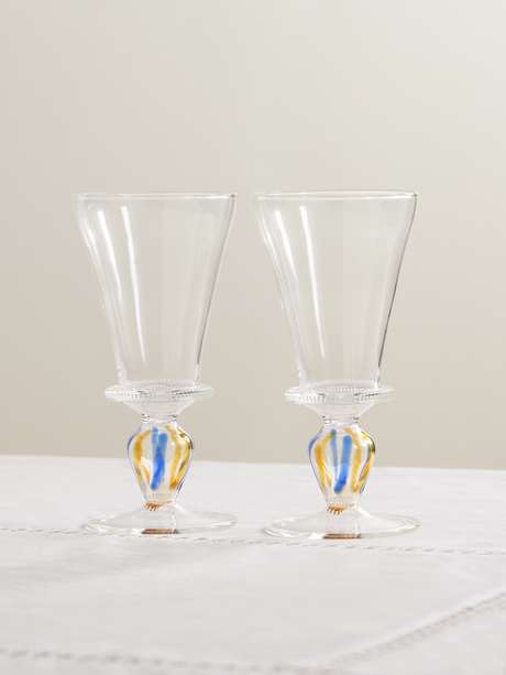 The colors of the Mediterranean inspire the striped stems on Gohar World's 'Alexandra' wine glasses. In a set of two, they're made from hand-blown glass and have an elegant, fluted shape with ribbed detailing. We have the accompanying decanter in our edit, too.