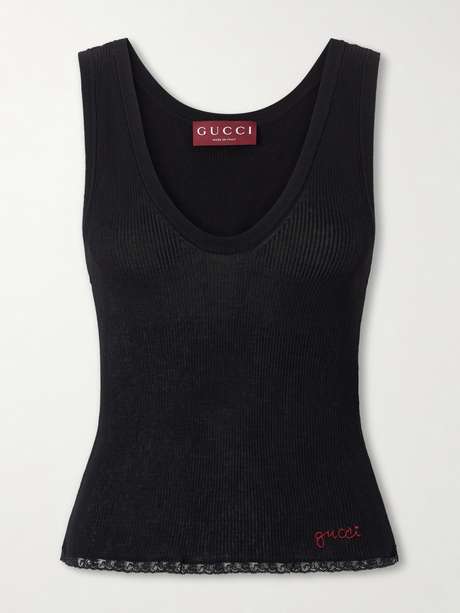 GUCCI Embroidered lace-trimmed ribbed-knit cotton tank top