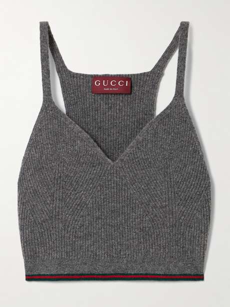 Gucci's camisole has been knitted in Italy from wool-blend in the label's 'Dark Dusty Gray' mélange. It's defined by a slim fit and patterned with classic stripes. Wear yours with one of the logo-adorned bags by your side.